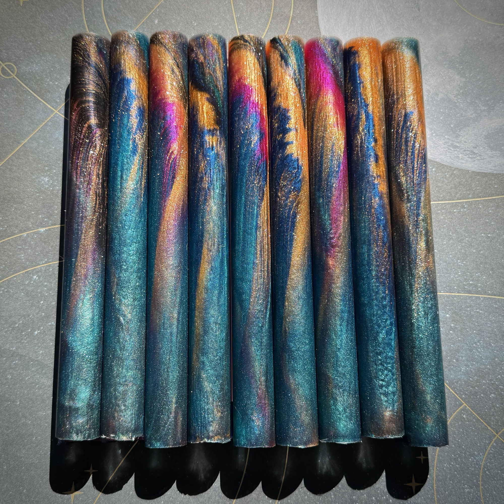This is a bespoke pen blank made of Alumilite Resin and contains high quality and ethically sourced mica pigments. These blanks are approximately 8 to 8.5 inches in length and 0.815 inches in diameter. This listing is for this blank design and colorway only. Each blank is unique and may not be the exact blank shown in the photo.