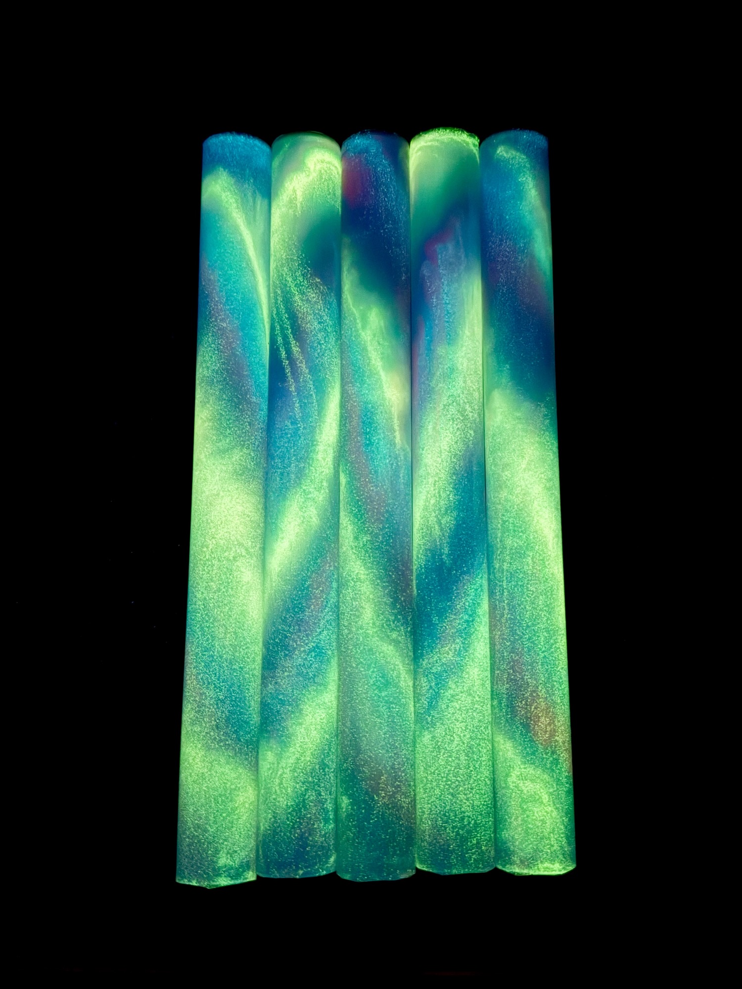 This batch is poured in the Galactic Spiral pattern and are some of our best spiral pours to date! They are also UV reactive and a blacklight will charge the glow in the dark effect quickly.