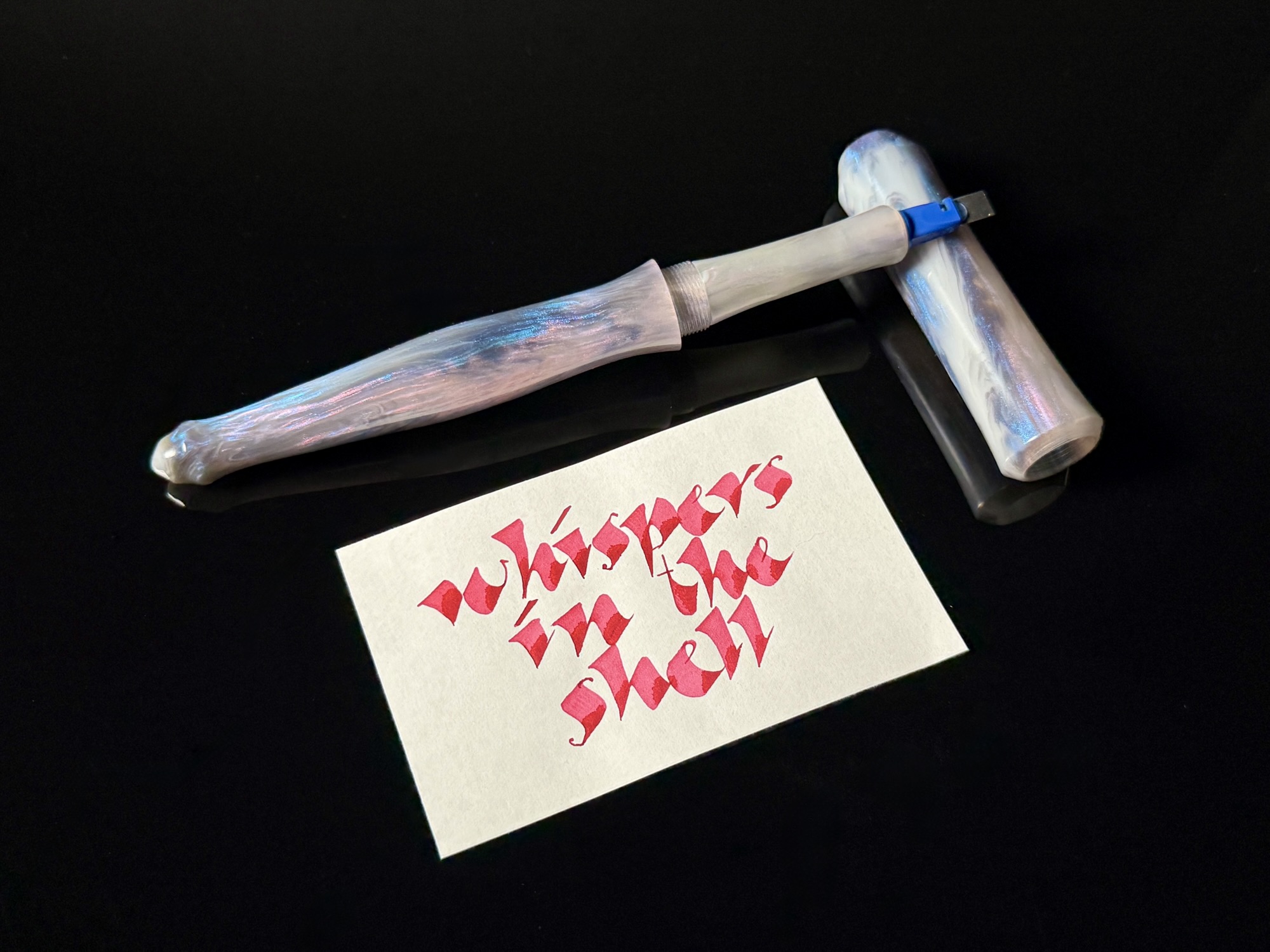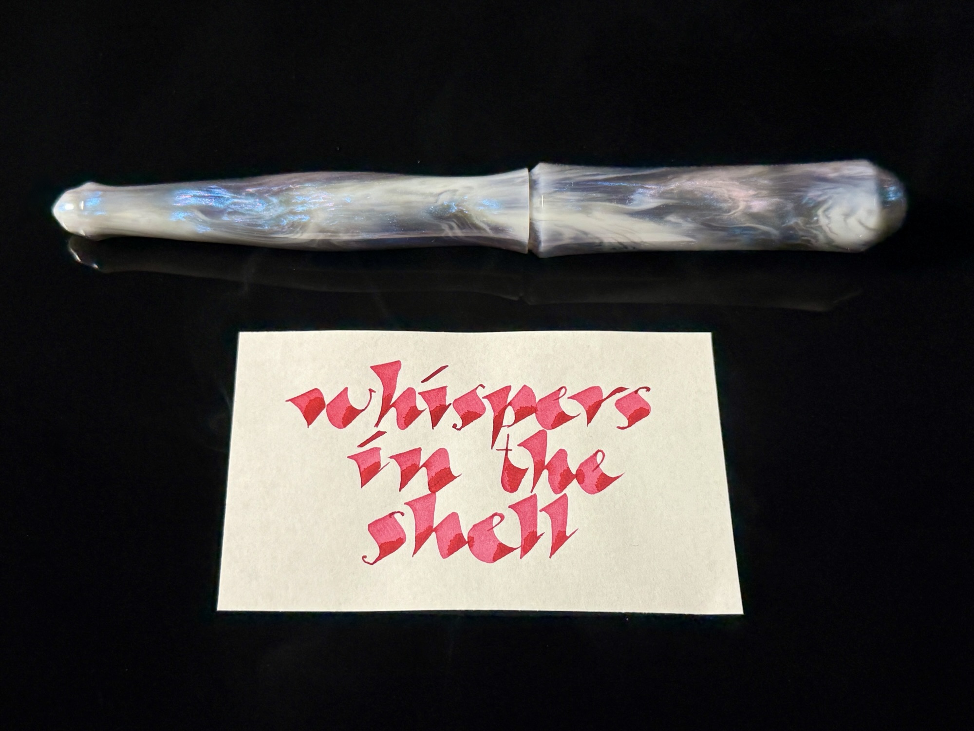 This blank is one of several explorations in interference/ghost pigments which give a color shifting effect and an abalone appearance. Galactic spiral and acanthus patterns were used for this pour.